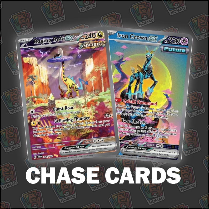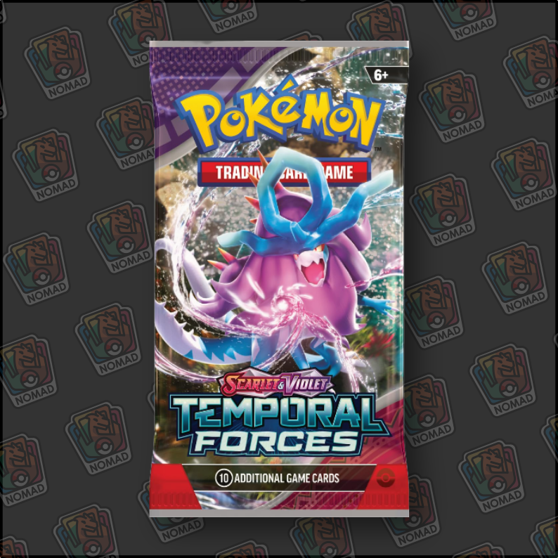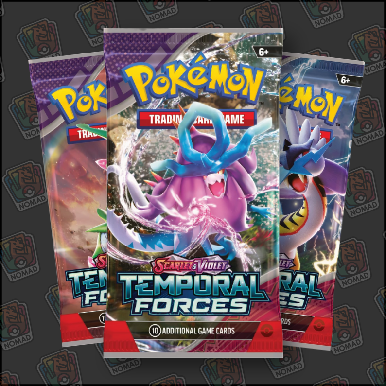 The ranks of Ancient and Future Pokémon continue to grow! Walking Wake ex breaks free of the past alongside Raging Bolt ex while Iron Leaves ex delivers high-tech justice with Iron Crown ex. Outside Area Zero, Wugtrio and Farigiraf shift types as Tera Pokémon ex, and Pokémon Trainers everywhere prepare for the return of ACE SPEC cards with uniquely powerful effects. A rupture in time brings wild beasts and cyber visions to battle in the Pokémon TCG: Scarlet & Violet—Temporal Forces expansion!